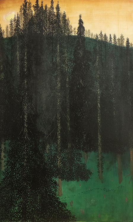 1877年に、スイスのベルン近郊にあるビールで生まれたカール・ヴァルザーは、シュトラスブルク(*2) の美術工芸学校で学んだあと、1899年からベルリンを中心に活動しました。1902年に、マックス・リーバーマンが会長を務めるベルリン分離派(*3) の展覧会に初出品し、翌年には会員になります。本の装幀や挿絵、舞台美術、壁画などの仕事をする一方で、この時期には象徴主義的な絵画にも取り組みました。鮮烈でありながら、世紀末の残照とでも言うべき昏(くら)さをともなう、寓意や含意を感じさせる神秘的な作品群は、観る者を強く惹きつける力をもっています。